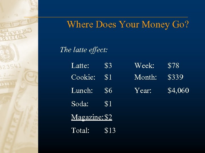 Where Does Your Money Go? The latte effect: Latte: Cookie: $3 $1 Week: Month: $78 $339 Lunch: $6 Year: $4, 060 Soda: $1 Magazine: $2 Total: $13