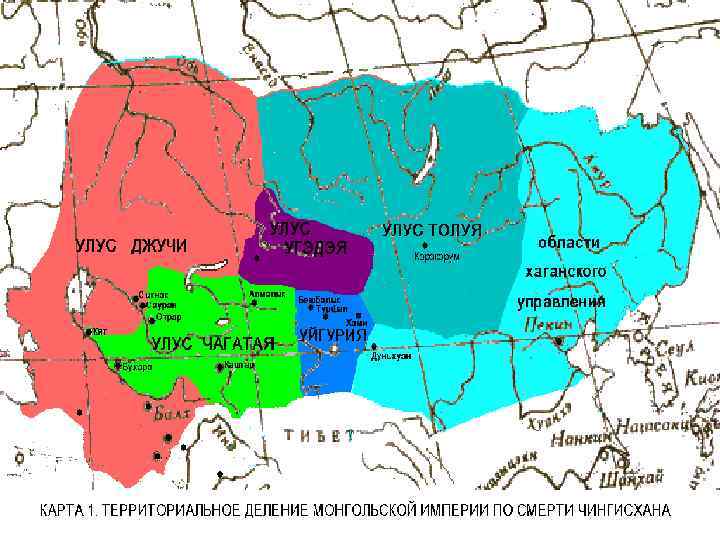 3. Создание системы улусов на территории Казахстана l l l Территория Казахстана вошла в состав трех монгольских улусов: Улус Джучи включал в себя: большую часть Казахстана, (к западу от Иртыша, северную часть Семиречья, весь Восточный Дешт-и Кыпчак до Нижнего Поволжья включительно). Улус Чагатая - Южный и Юго-Восточный Казахстан, Восточный Туркестан и Мавераннахр Улус Угедея - северо-восточную часть Казахстана (Тарбагатайские горы) и Западную Монголию. Младший сын Тулуй по монгольским обычаям должен был остаться дома и не претендовал на политическую власть.