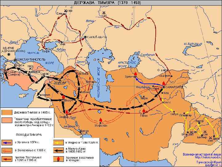 4. Золотая Орда l l l В 1395 году Тимур в результате очередного похода против Золотой Орды разорил столицу Сарай-Берке. Началась и внутренняя борьба. От этих ударов Золотая орда уже не смогла оправиться и распалась на несколько ханств: Ногайскую орду (начало XV века), Казанское (1438 год), Крымское (1443 год), Астраханское (1459 год), Сибирское (конец XV века) и другие.