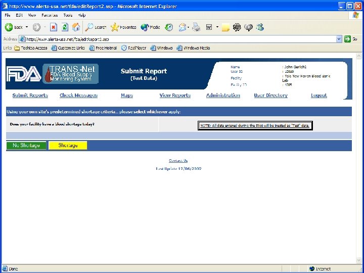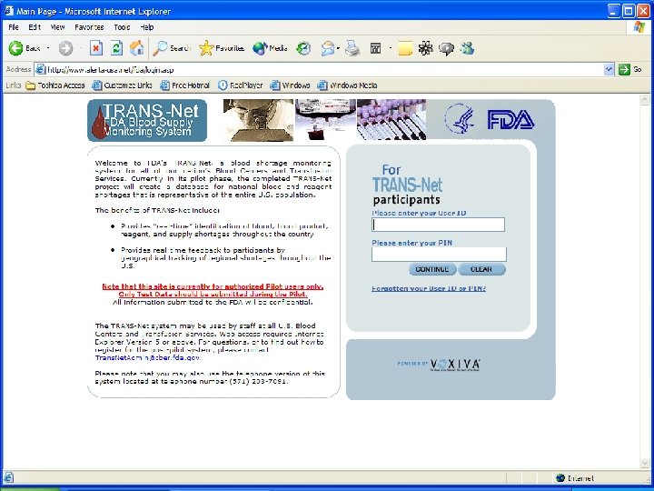 TRANS-Net Future • Phase I - Pilot (nine sites) 1/6/03 – 2/28/03 • Discussion within HHS/OMB Review • Phase II - Roll-out to several hundred participants – Monitoring at regional level – Functional mapping • Phase III- Full population of 145 blood centers and 5000+ transfusion services • Other uses: blood center inventory, platelet supply, adverse event reporting, supply/reagent shortage, electronic blood product request, public blood “thermometer”