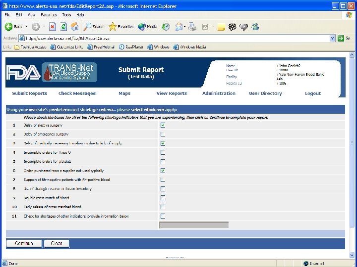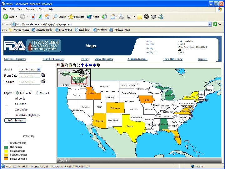 Trans-Net: Data Management Electronic data received and mapped at central FDA monitoring site Registration of reporting facilities allows verification/ followup of selected reports Data access through software that considers geo-spatial density and frequency of shortage reports ALERT message generated at predetermined threshold