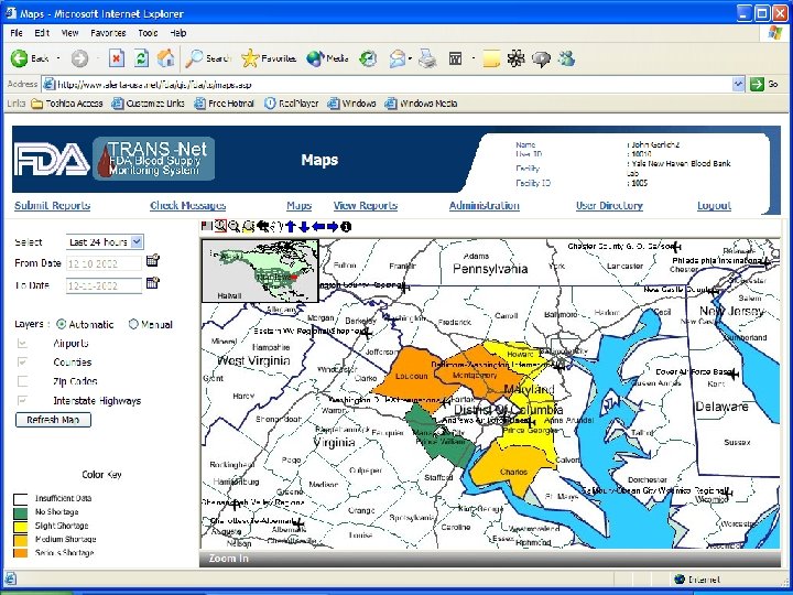 Trans-Net: Data Reporting Interactive public website – Data saved to an Oracle database – GIS mapping software provides public view of “real time” color-coded maps reflecting regional and national blood supplies – “Drill down” capability to n 5 respondents