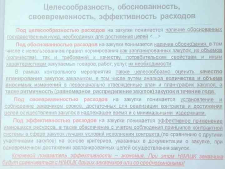 Что оценивается при проведении аудита? Законность Целесообразность Обоснованность Своевременность Эффективность и результативность закупки при планировании закупки , заключении контракта и на уровне исполнения контракта