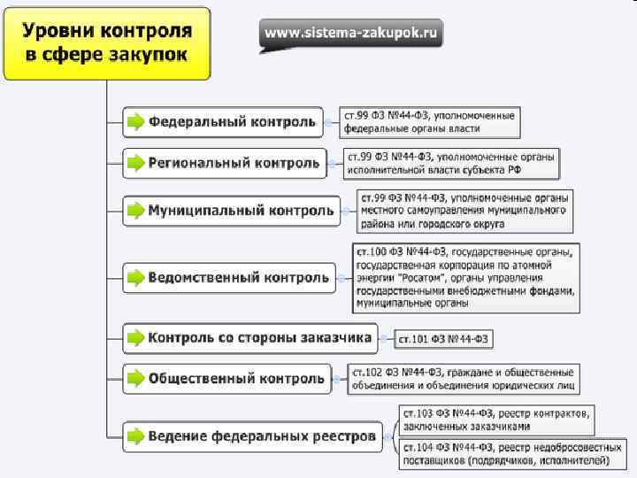 Контроль в сфере закупок можно разделить на следующие виды: Государственный и муниципальный (ст. 99 Закона N 44 -ФЗ); Ведомственный (ст. 100 Закона N 44 -ФЗ); Контроль, осуществляемый заказчиками (ст. 101 Закона N 44 -ФЗ); Общественный (ст. 102 Закона N 44 -ФЗ). Реестр контрактов и реестр недобросовестных контрагентов Закон N 44 -ФЗ также относит к инструментам контроля в сфере закупок.