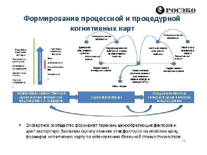«Формула цены» для целей «Общественных ценовых комитетов» . • «Формула цены» может быть представлена в виде уравнения: • • Ц = Б*М*Кц, где: Б – бальная оценка детерминированных (физических) характеристик; М – «масштаб» балла в денежном выражении, полученный на основе когнитивного картирования; Кц – калибровочные коэффициенты отношения расчетных и наблюдаемых цен. Параметры Б и М зависят от времени (T). В зависимости от объекта оценки учет (T) различен. , т. е. изменения на рынке труда, финансовом рынке и институты собственно и будут определять фактическую величину (уровень) цен рынка недвижимости. Для иных рынков, например особо модной одежды, ситуация может быть иной и функция Б(T) будет определяющей. Для построения М(T), если рассматривать процесс функционирования рынка как «марковский процесс» , то, задавшись базовым значением М(t-1), построив на основе анализа и суждений экспертов когнитивную карту исследуемого сегмента для M(t) и проведя калибровку на основе наблюдаемых на рыке данных о ценах, становиться возможным построение прогнозного значения М(t+1).
