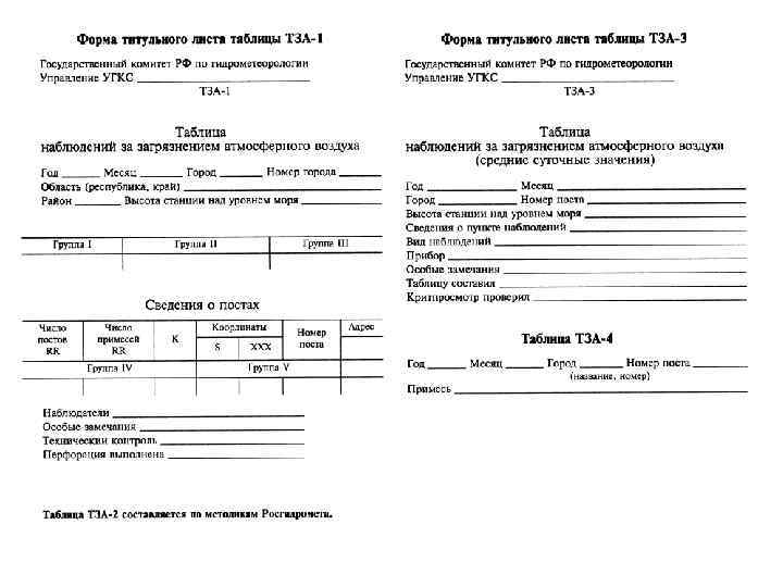 • Таблица ТЗА-1 состоит из основной и дополнительной (ТЗА-1 д) таблиц. ТЗА-1 содержит восемь страниц (100 -120 наблюдений в месяц). В нее записывают данные наблюдений за концентрациями примесей и метеопараметров, соответствующих срокам отбора проб воздуха на метеостанциях. Таблица ТЗА-1 д предназначена для записи концентраций примесей и метеорологических данных наблюдений на постах СЭН и других ведомств того же города. • Таблица ТЗА-2 составляется по методикам Росгидромета для каждого конкретного случая. После заполнения таблицы ТЗА-2 производят расчеты: средних концентраций (или выпадений) за все дни месяца; максимальных концентраций (или выпадений) за все дни месяца; то же за дни с осадками, в том числе с осадками до 5 мм и более; то же за дни без осадков. Для этих расчетов выбирают данные о скоростях ветра менее 2, 2 -5 и более 5 м/с, число случаев превышения ПДК. • За титульным листом ТЗА-4 следуют развернутые листы для записи фактических данных непрерывных наблюдений за концентрациями одной примеси по одному прибору. Количество листов ТЗА-4 должно соответствовать числу приборов в городе. Данные помещают в порядке возрастания номеров постов. После заполнения таблиц и переноса данных на машинный носитель их сшивают вместе таким образом, чтобы данные наблюдений за все сроки следовали в порядке возрастания номеров постов.