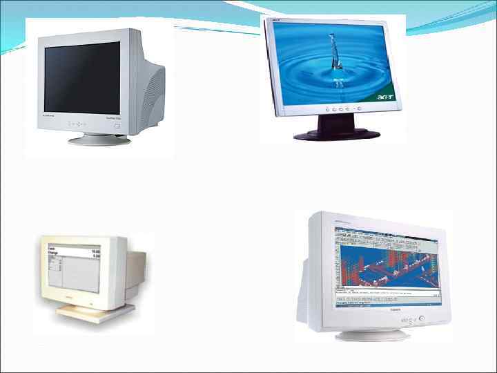 Мониторы Монитор - устройство визуального отображения информации (в виде текста, таблиц, рисунков, чертежей и др. ). Каждый монитор имеет свой определенный срок службы, который в среднем составляет пять лет. От выбора монитора напрямую зависит, как он будет влиять на Ваше зрение. Типы мониторов: • Электронно-лучевые; • Жидкокристаллический (LCD); • Газо-плазменные; • Сенсорные экраны.