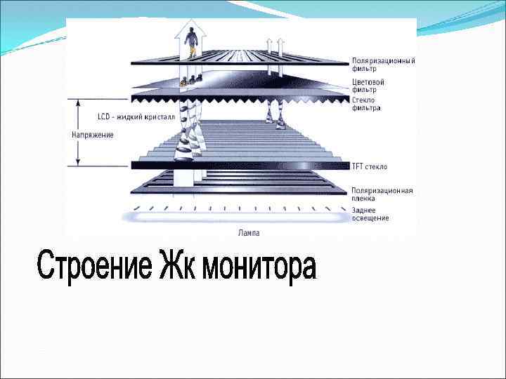 Жидкокристаллические дисплеи (LCD) Экран подобного LCD (Liquid Crystal Display) состоит из двух стеклянных пластин, между которыми находится масса, содержащая жидкие кристаллы, которые изменяют свои оптические свойства в зависимости от прилагаемого электрического заряда. Жидкие кристаллы сами не светятся, поэтому LCD нуждаются в подсветке или во внешнем освещении. Основным достоинством LCD являются их габариты (экран плоский). К недостаткам можно отнести недостаточное быстродействие при изменении изображения на экране, что особенно заметно при перемещении курсора мыши, а также зависимость резкости и яркости изображения от угла зрения.