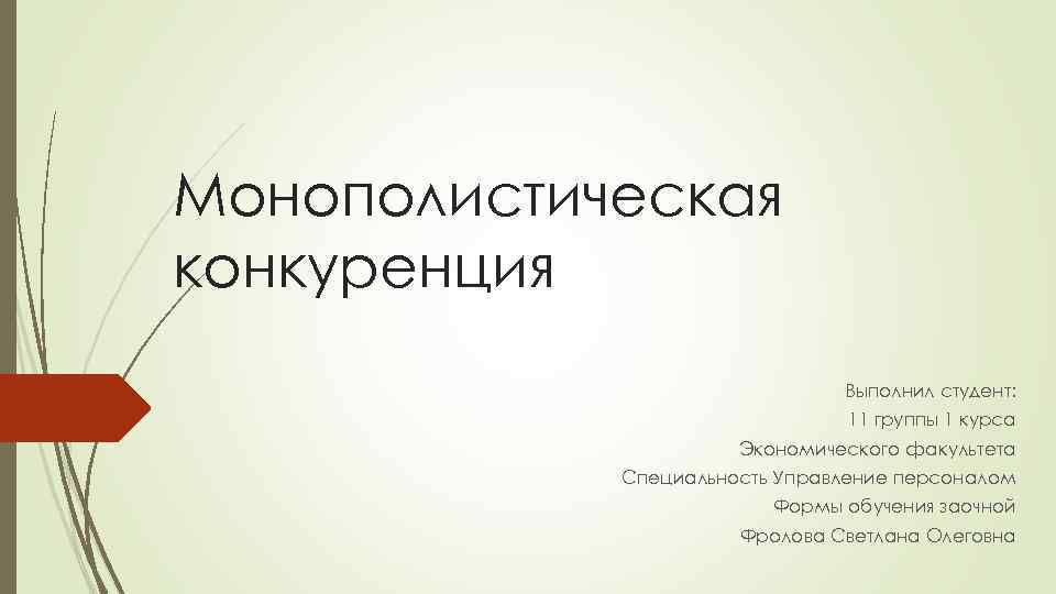 Монополистическая конкуренция Выполнил студент: 11 группы 1 курса Экономического факультета Специальность Управление персоналом Формы обучения заочной Фролова Светлана Олеговна