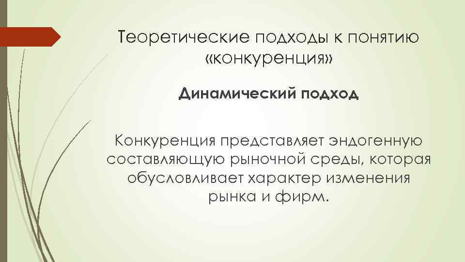 Теоретические подходы к понятию «конкуренция» Динамический подход Конкуренция представляет эндогенную составляющую рыночной среды, которая обусловливает характер изменения рынка и фирм.