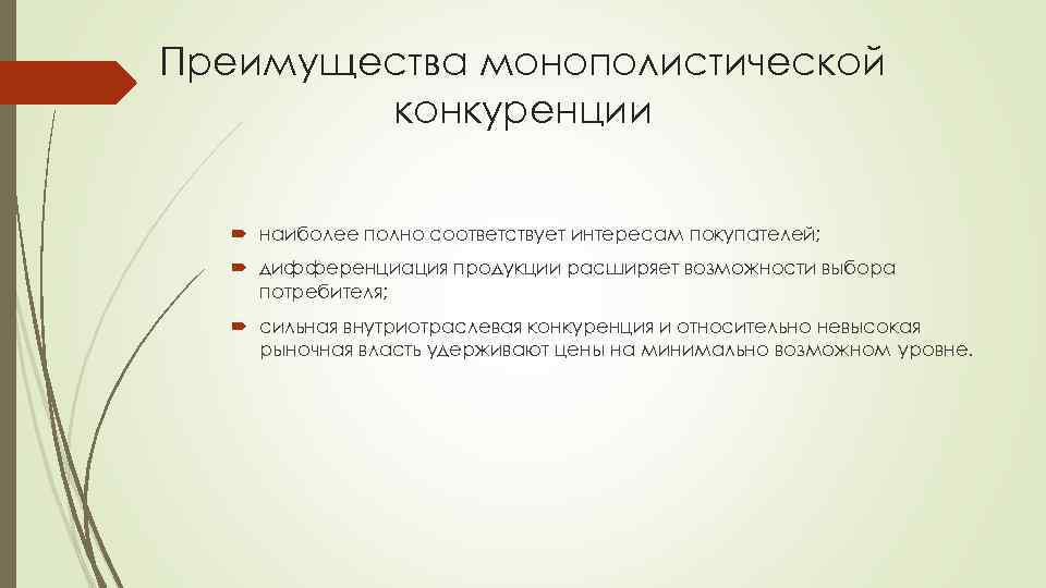 Преимущества монополистической конкуренции наиболее полно соответствует интересам покупателей; дифференциация продукции расширяет возможности выбора потребителя; сильная внутриотраслевая конкуренция и относительно невысокая рыночная власть удерживают цены на минимально возможном уровне.