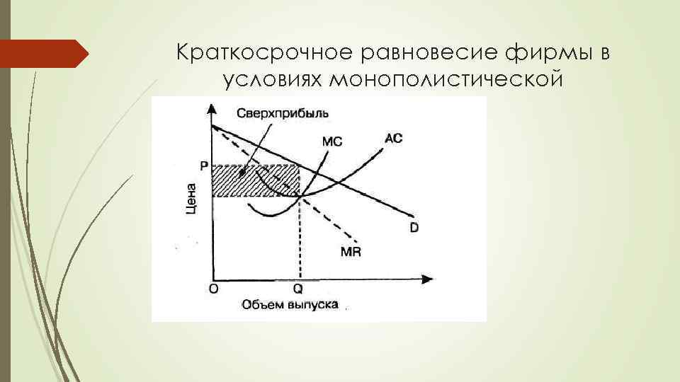 Оптимальный объем производства и цена в условиях монополистической конкуренции в коротком периоде Фирма, максимизирующая прибыль, будет стремиться осуществлять производство при такой комбинации цены и объема выпуска, которая уравнивает предельные издержки и предельный доход