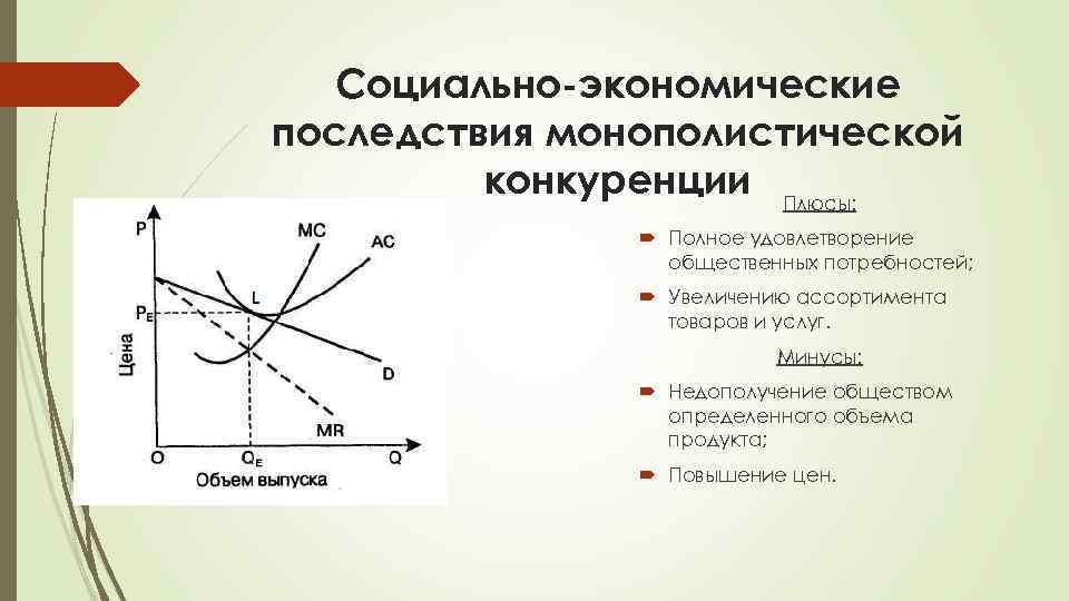 Cоциально-экономические последствия монополистической конкуренции Плюсы: Полное удовлетворение общественных потребностей; Увеличению ассортимента товаров и услуг. Минусы: Недополучение обществом определенного объема продукта; Повышение цен.