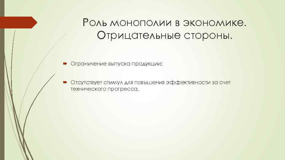 Роль монополии в экономике. Отрицательные стороны. Ограничение выпуска продукции; Отсутствует стимул для повышения эффективности за счет технического прогресса.