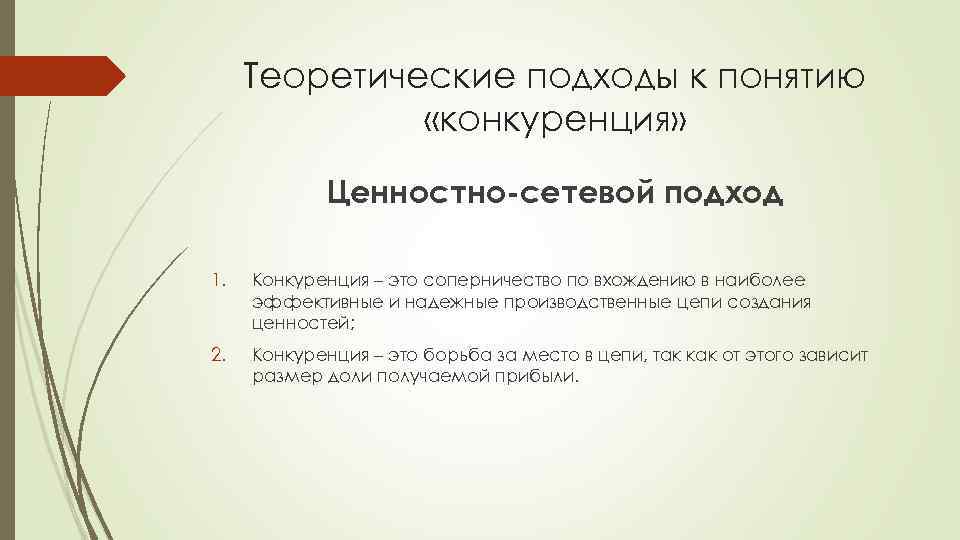 Теоретические подходы к понятию «конкуренция» Ценностно-сетевой подход 1. Конкуренция – это соперничество по вхождению в наиболее эффективные и надежные производственные цепи создания ценностей; 2. Конкуренция – это борьба за место в цепи, так как от этого зависит размер доли получаемой прибыли.