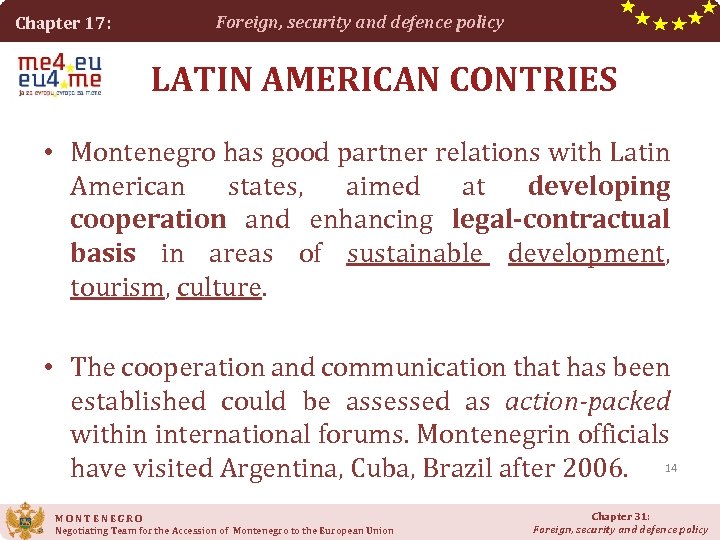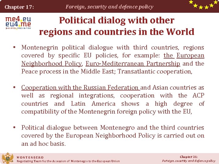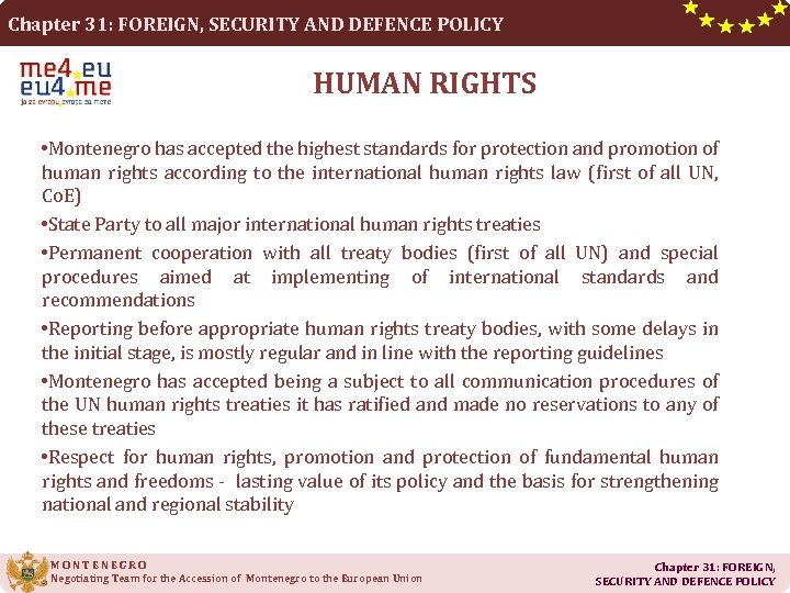 Chapter 31: FOREIGN, SECURITY AND DEFENCE POLICY HUMAN RIGHTS • • Member state of the UN Human Rights Council for the term 2013 -2015 As a HRC member state, Montenegro is fully committed to the principles of universality, impartiality, objectivity, non-selectivity and constructive international dialogue and cooperation in the field of human rights Voluntary pledges and Commitments of Montenegro as a candidate/member of the UN HRC: http: //www. un. org/ga/search/view_doc. asp? symbol=A/67/123 Montenegro has been acting in accordance with accepted international standards and advocating for universal implementation of the international human rights law Its activities in multilateral forums in the field of human rights are fully in line with the EU common positions (the GA Third Committee, Human Rights Council; cooperation has been intensified in 2013 within the UN HRC sessions) As a HRC member state, Montenegro expects to strengthen its professional capacities for specific aspects of human rights issues, which will contribute to development of national capacities for participation in the human rights dialogue as a tool of the EU common foreign policy, once the membership criteria have been met To that end, Montenegro will put special focus on the EU guidelines for the human rights dialogue and the EU human rights guidelines MONTENEGRO Negotiating Team for the Accession of Montenegro to the European Union Chapter 31: FOREIGN, SECURITY AND DEFENCE POLICY