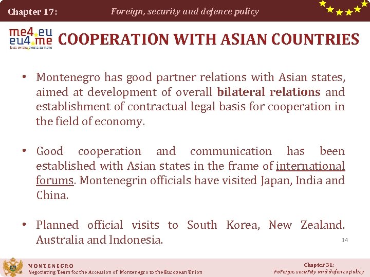 Chapter 17: Foreign, security and defence policy COOPERATION WITH ASIAN COUNTRIES • Montenegro has good partner relations with Asian states, aimed at development of overall bilateral relations and establishment of contractual legal basis for cooperation in the field of economy. • Good cooperation and communication has been established with Asian states in the frame of international forums. Montenegrin officials have visited Japan, India and China. • Planned official visits to South Korea, New Zealand. 14 Australia and Indonesia. MONTENEGRO Negotiating Team for the Accession of Montenegro to the European Union Chapter 31: Foreign, security and defence policy