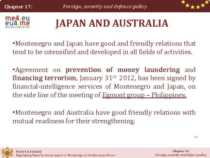 Chapter 17: Foreign, security and defence policy JAPAN AND AUSTRALIA • Montenegro and Japan have good and friendly relations that tend to be intensified and developed in all fields of activities. • Agreement on prevention of money laundering and financing terrorism, January 31 st 2012, has been signed by financial-intelligence services of Montenegro and Japan, on the side line of the meeting of Egmont group – Philippines. • Montenegro and Australia have good friendly relations with mutual readiness for their strengthening. 14 MONTENEGRO Negotiating Team for the Accession of Montenegro to the European Union Chapter 31: Foreign, security and defence policy