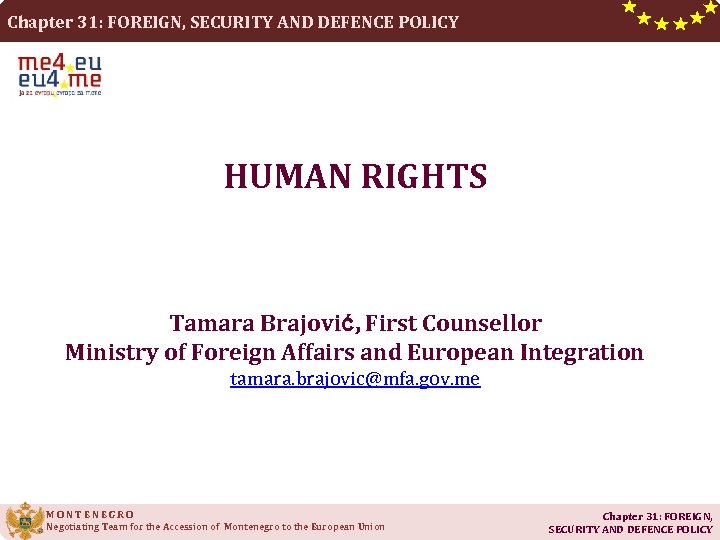 Chapter 31: FOREIGN, SECURITY AND DEFENCE POLICY HUMAN RIGHTS Tamara Brajović, First Counsellor Ministry of Foreign Affairs and European Integration tamara. brajovic@mfa. gov. me MONTENEGRO Negotiating Team for the Accession of Montenegro to the European Union Chapter 31: FOREIGN, SECURITY AND DEFENCE POLICY