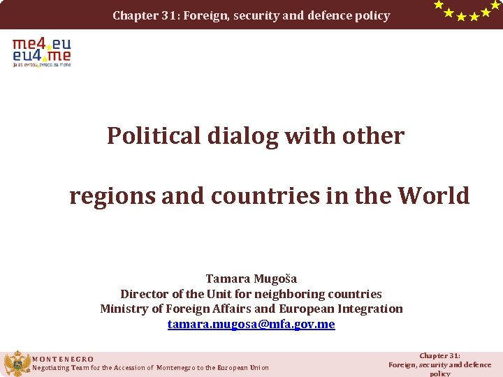 Chapter 31: Foreign, security and defence policy Political dialog with other regions and countries in the World Tamara Mugoša Director of the Unit for neighboring countries Ministry of Foreign Affairs and European Integration tamara. mugosa@mfa. gov. me MONTENEGRO Negotiating Team for the Accession of Montenegro to the European Union Chapter 31: Foreign, security and defence policy