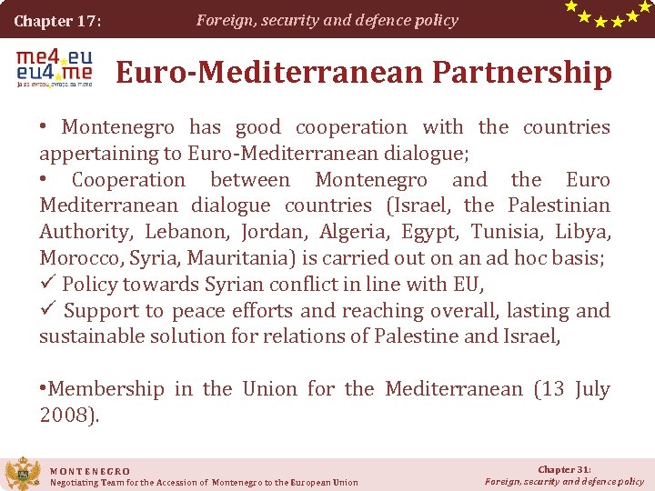 Chapter 17: Foreign, security and defence policy Euro-Mediterranean Partnership • Montenegro has good cooperation with the countries appertaining to Euro-Mediterranean dialogue; • Cooperation between Montenegro and the Euro Mediterranean dialogue countries (Israel, the Palestinian Authority, Lebanon, Jordan, Algeria, Egypt, Tunisia, Libya, Morocco, Syria, Mauritania) is carried out on an ad hoc basis; ü Policy towards Syrian conflict in line with EU, ü Support to peace efforts and reaching overall, lasting and sustainable solution for relations of Palestine and Israel, • Membership in the Union for the Mediterranean (13 July 2008). MONTENEGRO Negotiating Team for the Accession of Montenegro to the European Union 4 Chapter 31: Foreign, security and defence policy