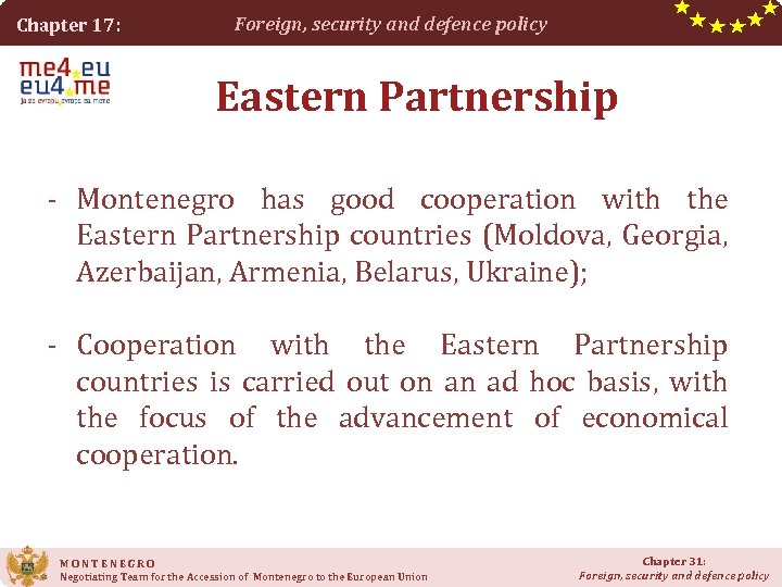 Chapter 17: Foreign, security and defence policy Eastern Partnership - Montenegro has good cooperation with the Eastern Partnership countries (Moldova, Georgia, Azerbaijan, Armenia, Belarus, Ukraine); - Cooperation with the Eastern Partnership countries is carried out on an ad hoc basis, with the focus of the advancement of economical cooperation. MONTENEGRO Negotiating Team for the Accession of Montenegro to the European Union 5 Chapter 31: Foreign, security and defence policy