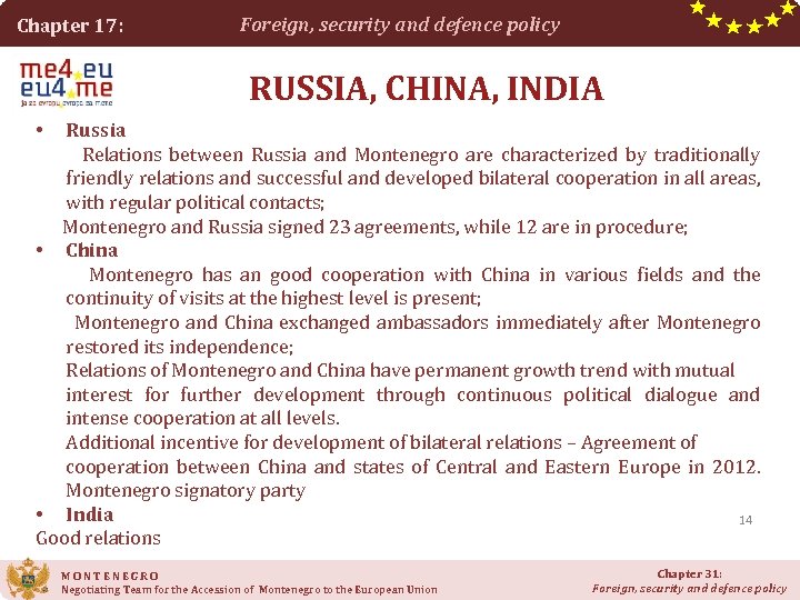 Chapter 17: Foreign, security and defence policy RUSSIA, CHINA, INDIA Russia Relations between Russia and Montenegro are characterized by traditionally friendly relations and successful and developed bilateral cooperation in all areas, with regular political contacts; Montenegro and Russia signed 23 agreements, while 12 are in procedure; • China Montenegro has an good cooperation with China in various fields and the continuity of visits at the highest level is present; Montenegro and China exchanged ambassadors immediately after Montenegro restored its independence; Relations of Montenegro and China have permanent growth trend with mutual interest for further development through continuous political dialogue and intense cooperation at all levels. Additional incentive for development of bilateral relations – Agreement of cooperation between China and states of Central and Eastern Europe in 2012. Montenegro signatory party • India 14 Good relations • MONTENEGRO Negotiating Team for the Accession of Montenegro to the European Union Chapter 31: Foreign, security and defence policy