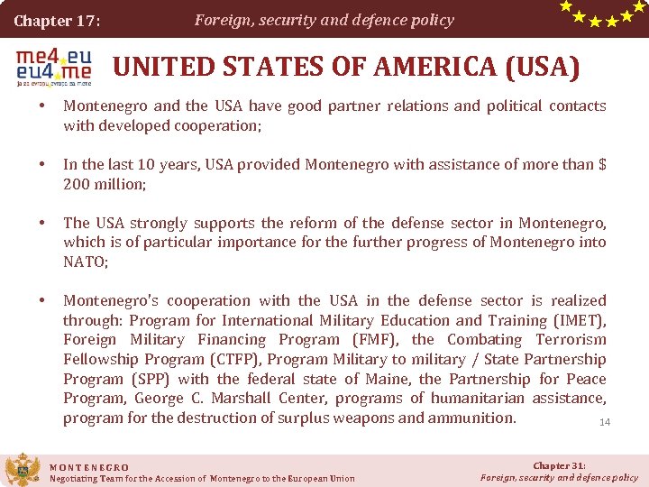 Chapter 17: Foreign, security and defence policy UNITED STATES OF AMERICA (USA) • Montenegro and the USA have good partner relations and political contacts with developed cooperation; • In the last 10 years, USA provided Montenegro with assistance of more than $ 200 million; • The USA strongly supports the reform of the defense sector in Montenegro, which is of particular importance for the further progress of Montenegro into NATO; • Montenegro's cooperation with the USA in the defense sector is realized through: Program for International Military Education and Training (IMET), Foreign Military Financing Program (FMF), the Combating Terrorism Fellowship Program (CTFP), Program Military to military / State Partnership Program (SPP) with the federal state of Maine, the Partnership for Peace Program, George C. Marshall Center, programs of humanitarian assistance, program for the destruction of surplus weapons and ammunition. 14 MONTENEGRO Negotiating Team for the Accession of Montenegro to the European Union Chapter 31: Foreign, security and defence policy