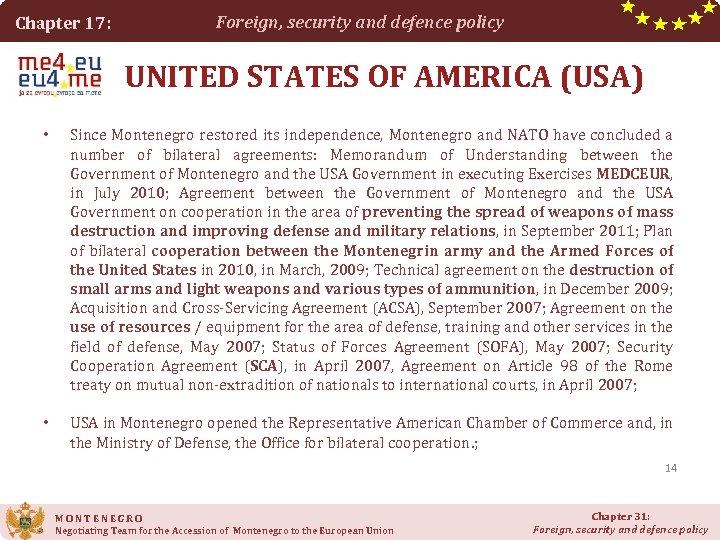Chapter 17: Foreign, security and defence policy UNITED STATES OF AMERICA (USA) • Since Montenegro restored its independence, Montenegro and NATO have concluded a number of bilateral agreements: Memorandum of Understanding between the Government of Montenegro and the USA Government in executing Exercises MEDCEUR, in July 2010; Agreement between the Government of Montenegro and the USA Government on cooperation in the area of preventing the spread of weapons of mass destruction and improving defense and military relations, in September 2011; Plan of bilateral cooperation between the Montenegrin army and the Armed Forces of the United States in 2010, in March, 2009; Technical agreement on the destruction of small arms and light weapons and various types of ammunition, in December 2009; Acquisition and Cross-Servicing Agreement (ACSA), September 2007; Agreement on the use of resources / equipment for the area of defense, training and other services in the field of defense, May 2007; Status of Forces Agreement (SOFA), May 2007; Security Cooperation Agreement (SCA), in April 2007, Agreement on Article 98 of the Rome treaty on mutual non-extradition of nationals to international courts, in April 2007; • USA in Montenegro opened the Representative American Chamber of Commerce and, in the Ministry of Defense, the Office for bilateral cooperation. ; 14 MONTENEGRO Negotiating Team for the Accession of Montenegro to the European Union Chapter 31: Foreign, security and defence policy