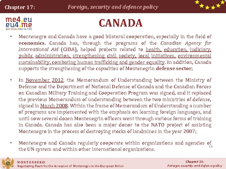 Chapter 17: Foreign, security and defence policy CANADA • Montenegro and Canada have a good bilateral cooperation, especially in the field of economics. Canada has, through the programs of the Canadian Agency for International Aid (CIDA), helped projects related to health, education, judiciary, public administration, strengthening civil society, local initiatives, environmental sustainability, combating human trafficking and gender equality. In addition, Canada supports the strengthening of the capacities of Montenegrin defense sector; • In November 2012. the Memorandum of Understanding between the Ministry of Defense and the Department of National Defense of Canada and the Canadian Forces on Canadian Military Training and Cooperation Program was signed, and it replaced the previous Memorandum of understanding between the two ministries of defense, signed in March 2008. Within the frame of Memorandum of Understanding a number of programs are implemented with the emphasis on learning foreign languages, and until now several dozen Montenegrin officers went through various forms of training in Canada has also been a major donor to the NATO project of assisting Montenegro in the process of destroying stocks of landmines in the year 2007; • Montenegro and Canada regularly cooperate within organizations and agencies of 14 the UN system and within other international organizations. MONTENEGRO Negotiating Team for the Accession of Montenegro to the European Union Chapter 31: Foreign, security and defence policy