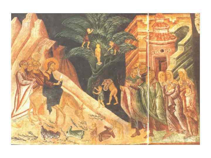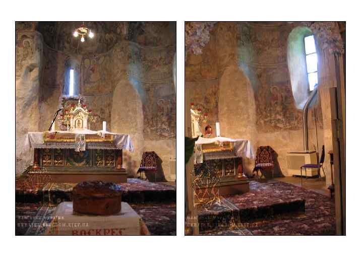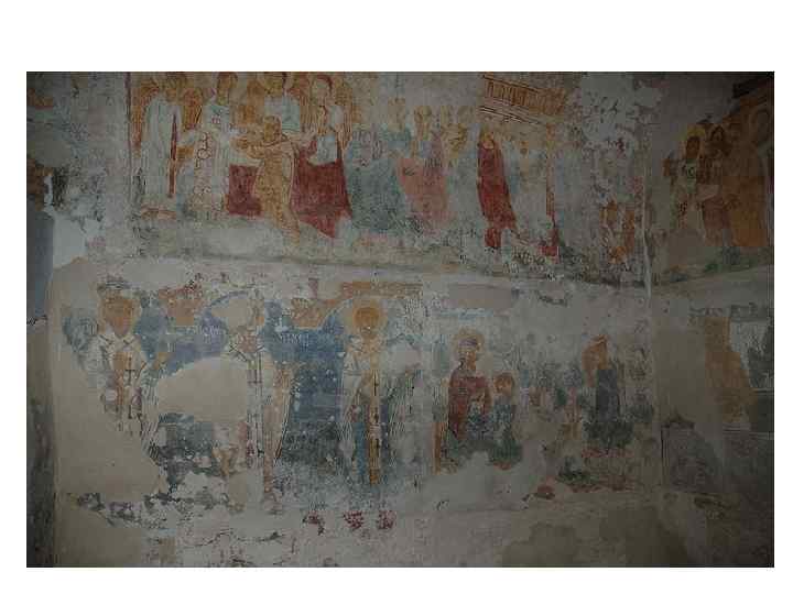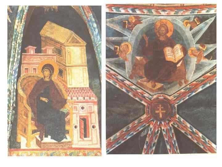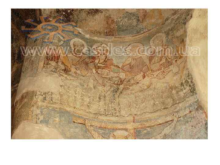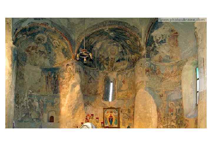Комплекс фресок 14 ст. • Головна постать зображень – Богородиця (характерно для українського мистецтва 14 -16 ст. ) • Колористика: сіро-блакитні, бузкові тони • Розписи розташовані: • у 3 яруси у склепіннях конх • У 2 яруси – на стінах • Головні сюжети (всюди центральним образ Богородиці): • • • “Благовіщення” “Різдво ” “Дари волхвів” “Втеча до Єгипту” “Страсті” “Воскресіння”