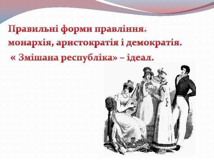 Правильні форми правління: монархія, аристократія і демократія. « Змішана республіка» – ідеал.