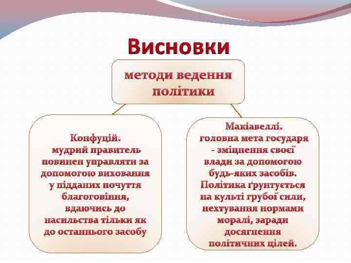 Висновки методи ведення політики Конфуцій: мудрий правитель повинен управляти за допомогою виховання у підданих почуття благоговіння, вдаючись до насильства тільки як до останнього засобу Макіавеллі: головна мета государя - зміцнення своєї влади за допомогою будь-яких засобів. Політика ґрунтується на культі грубої сили, нехтування нормами моралі, заради досягнення політичних цілей.
