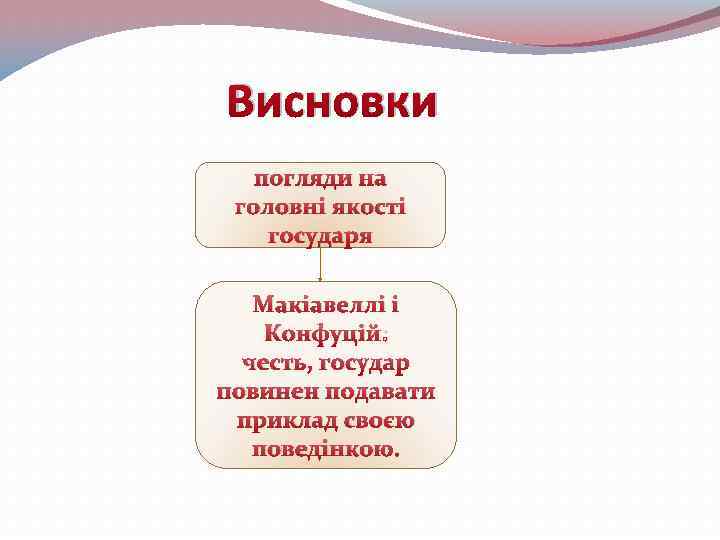 Висновки принципи побудови влади Конфуцій: внутрішньодержавні відносини - добрі сімейні стосунки, коли старші (правителі) люблять молодших і піклуються про них, а молодші (підлеглі) відповідають любов'ю і відданістю, тобто на принципах «людяності» і «справедливості» Макіавеллі: головна мета - сильна держава, на чолі якого стоїть сильний государ.