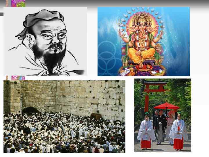 Этапы эволюции религии Национально-государственные религии (иудаизм - Израиль, индуизм - Индия, синтоизм Япония, конфуцианство - Китай и др. ) 1) возникли в период разложения родового строя и возникновения классового 2) поклонение богам – покровителям своего народа 3) сложная обрядность с элементами национальной культуры 4) оформился особый слой служителей культа (жрецы)