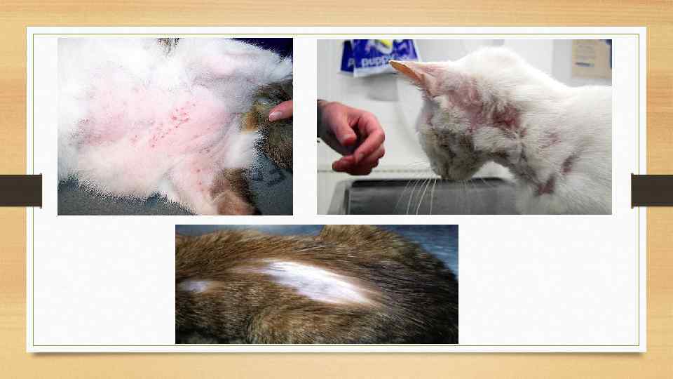 Грибковые и паразитарные заболевания • К грибковым патологиям относится дерматофитоз. Характерные симптомы данного состояния это выпадение волос, шелушение и воспалительный процесс. Кожа становится красной, появляется зуд, вызывающий изменение в поведении животного. При отсутствии лечения пятна увеличиваются в размере. Лечение связано с применением противогрибковых препаратов в виде мазей и исключением расчёсывания. • Болезни, вызванные клещами, занимают большую часть всех патологий. При этом наблюдаются такие симптомы как сильный зуд, облысение, а присоединении вторичной инфекции - целые участки воспаления. Лечение заболевания связано с устранением зуда и гигиены кожных покровов. При этом особенно особое значение уделяется профилактике, то есть использованию спреев и капель от блох, клещей и других переносчиков инфекции.