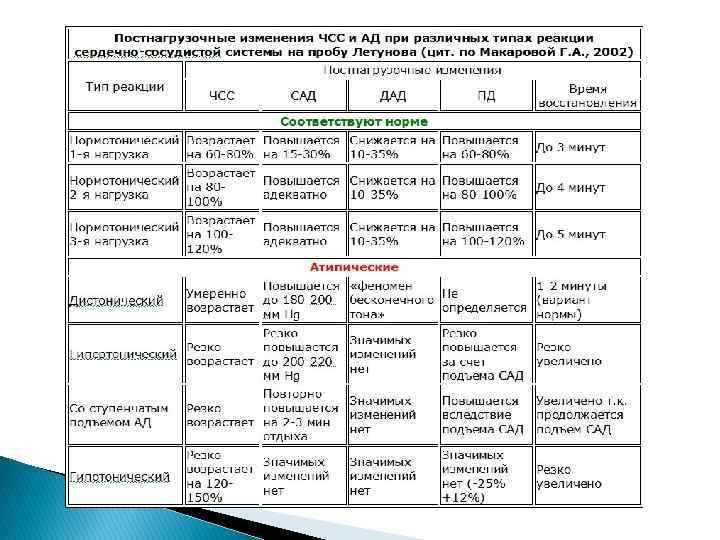 Оценка результатов пробы производится по типу ответной реакции: (нормотонический, гипертонический, дистонический и реакция со ступенчатым подъемом максимального АД), а также по времени к характеру восстановления пульса и АД.