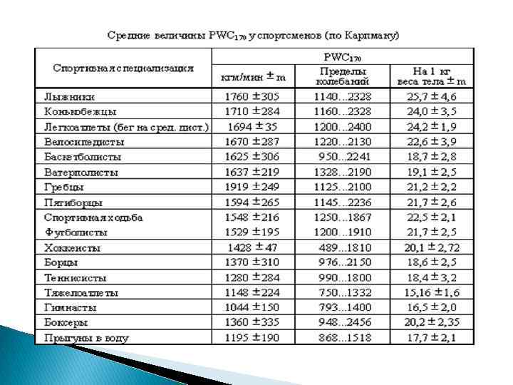 Тестирующие нагрузки максимальной аэробной мощности: Тест на удержание нагрузки на уровне " критической " мощности. Величина нагрузки определяется индивидуально для каждого спортсмена по результатам выполнения нагрузки ступенчасто-повышающейся мощности. "Критическая" мощность нагрузки ( Wкр , Вт / кг ) определялась как и найменьшая мощность нагрузки , при которой впервые достигался максимальный уровень потребления O 2. Тестируя нагрузки на уровне Wкр выполнялась с постоянной скоростью (10 км/ч) до момента произвольной отказа испытуемого продолжать выполнять работу. Такой вид тестирующего нагрузки используется для определения максимальной аэробной ёмкости - время удержания Wкр ( Ткр , мин. ).