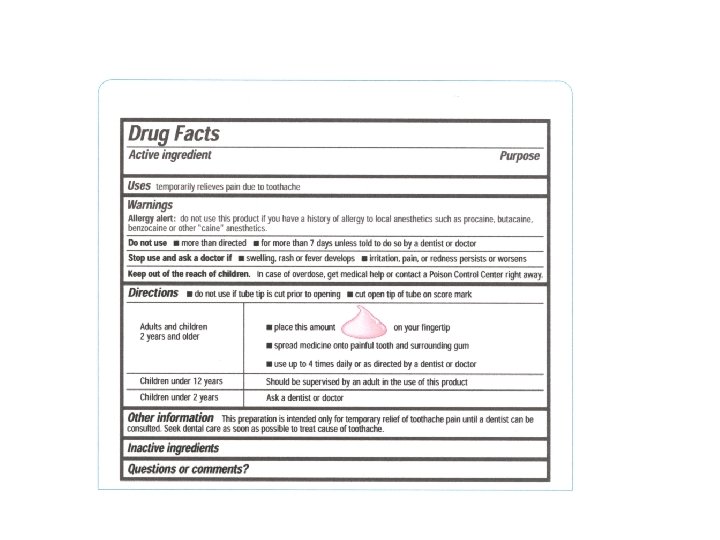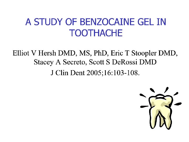 Hersh EV et al Efficacy, Tolerability and Label Compliance of Topical 10% and 20% Benzocaine Gels in Patients with Acute Toothache. JADA; 2013; 144: 517 -526. Treatments Responders, n (%) Vehicle (n=115) 81 (70. 4) 10% Benzocaine (n=233) 188 (80. 7) 20% Benzocaine (n=228) 199 (87. 3) Observed Treatment Differences (%) P-value@ 20% Benzocaine vs. Vehicle 16. 8 <0. 001* 10% Benzocaine vs. Vehicle 10. 3 0. 038* 20% Benzocaine vs. 10% benzocaine 6. 6 0. 043 Pair Wise Comparisons