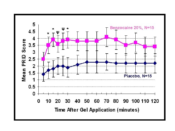 Mean PRID score 4 * *** + * * 3 Vehicle 10% benzocaine 2 1 0 0 30 60 90 120 Time (minutes) Hersh EV et al Efficacy, Tolerability and Label Compliance of Topical 10% and 20% Benzocaine Gels in Patients with Acute Toothache. JADA; 2013; 144: 517 -526.