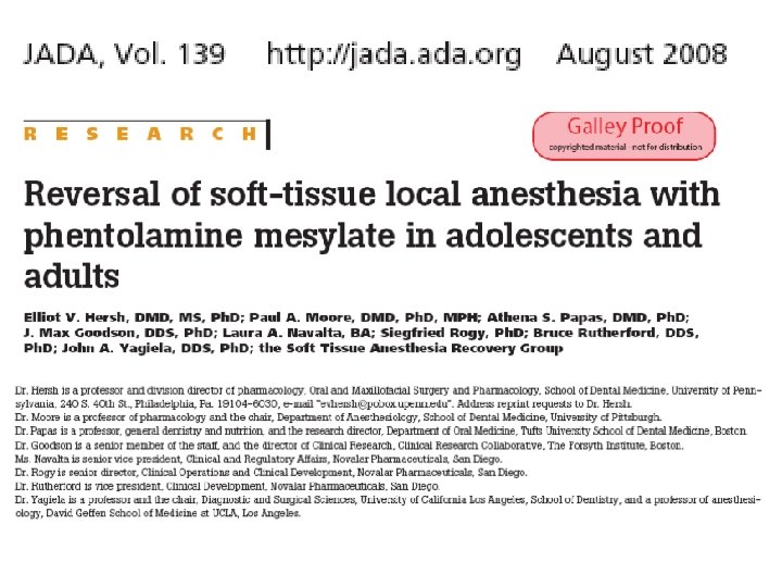 7 carpules of Articaine with Epi in Healthy Young Adults * * p < 0. 05 vs A 200 Hersh EV, Giannakopoulos H, Levin LM, Secreto S, Moore PA, Peterson C, Hutcheson M, Bouhajib M, Mosenkis A, Townsend RR. JADA 2006; 137: 1562 -1571.