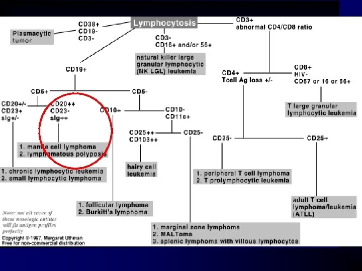 n Morphology : Large (> 3 times of RBC), reticular chromatin, deeply basophilic cytoplasm and 1 -3 nucleoli. n Immunophenotype : Clonal B-cell population kappa+, lambda-, CD 19+, FMC 7+, and negative with CD 5, CD 23 & CD 2.