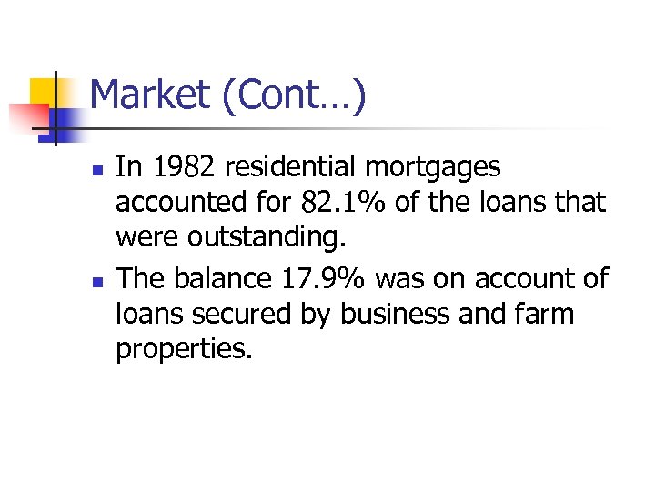 Market (Cont…) n n In 1982 residential mortgages accounted for 82. 1% of the loans that were outstanding. The balance 17. 9% was on account of loans secured by business and farm properties.