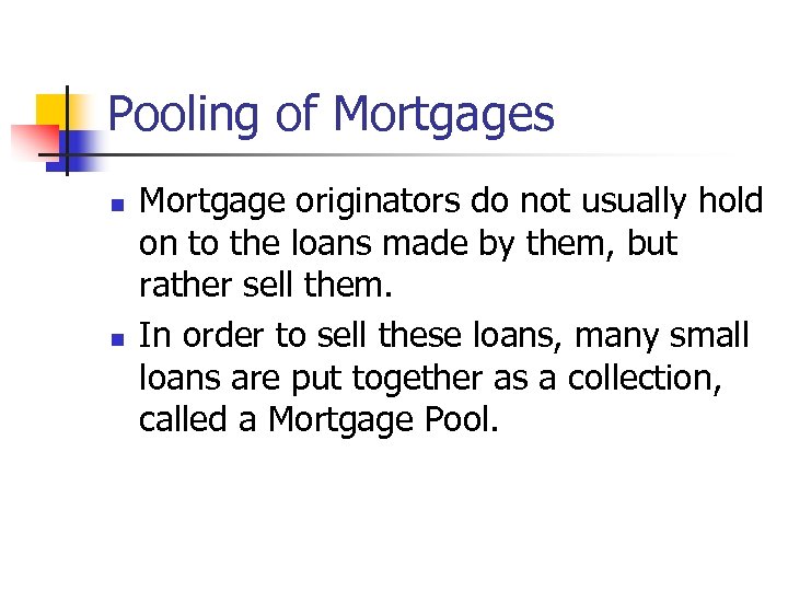 Pooling of Mortgages n n Mortgage originators do not usually hold on to the loans made by them, but rather sell them. In order to sell these loans, many small loans are put together as a collection, called a Mortgage Pool.