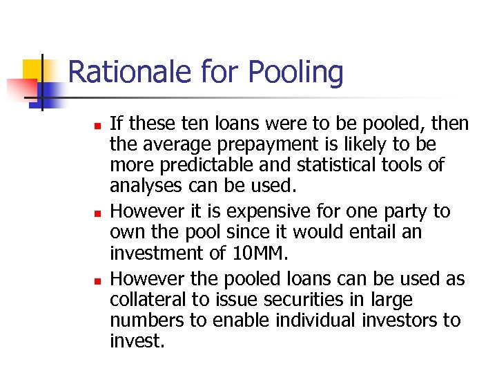Rationale for Pooling n n n If these ten loans were to be pooled, then the average prepayment is likely to be more predictable and statistical tools of analyses can be used. However it is expensive for one party to own the pool since it would entail an investment of 10 MM. However the pooled loans can be used as collateral to issue securities in large numbers to enable individual investors to invest.