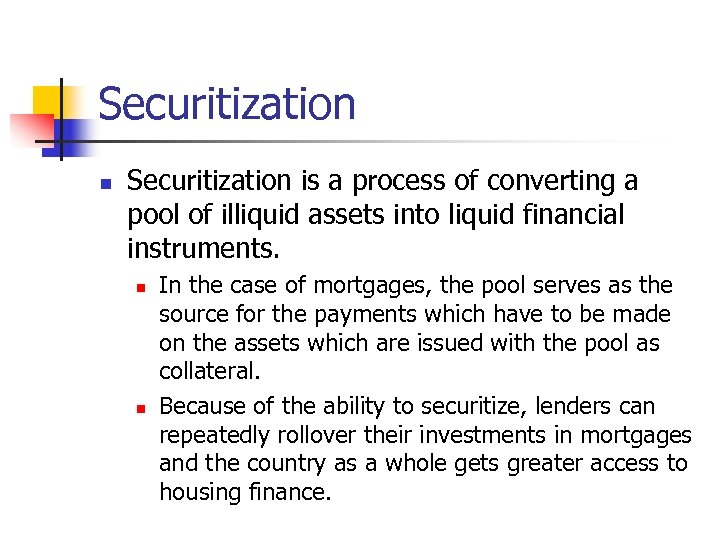 Securitization n Securitization is a process of converting a pool of illiquid assets into liquid financial instruments. n n In the case of mortgages, the pool serves as the source for the payments which have to be made on the assets which are issued with the pool as collateral. Because of the ability to securitize, lenders can repeatedly rollover their investments in mortgages and the country as a whole gets greater access to housing finance.