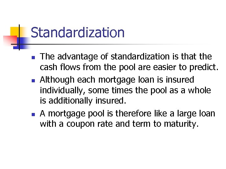 Standardization n n Before pooling mortgage loans care is taken to standardize the loans. This means that all the pooled loans will have: n n n The same rate of interest. The same period to maturity. The same kind of insurance. The same kind of property. And will come from the same geographical location.