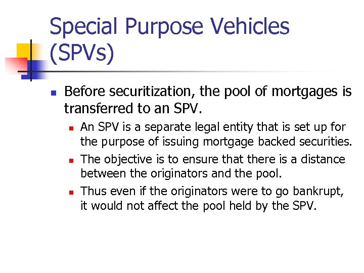 Special Purpose Vehicles (SPVs) n Before securitization, the pool of mortgages is transferred to an SPV. n n n An SPV is a separate legal entity that is set up for the purpose of issuing mortgage backed securities. The objective is to ensure that there is a distance between the originators and the pool. Thus even if the originators were to go bankrupt, it would not affect the pool held by the SPV.