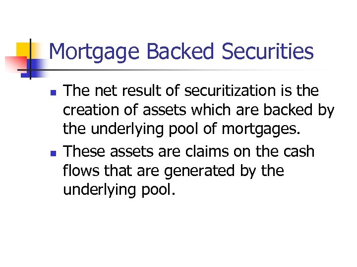 Mortgage Backed Securities n n The net result of securitization is the creation of assets which are backed by the underlying pool of mortgages. These assets are claims on the cash flows that are generated by the underlying pool.