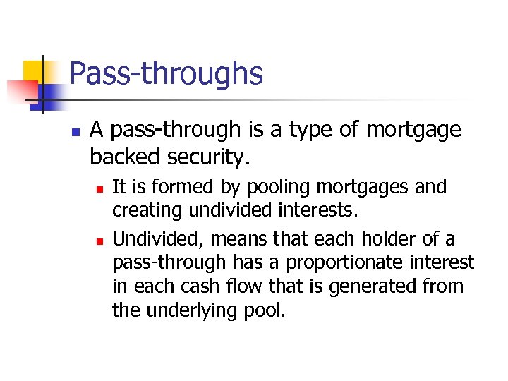 Pass-throughs n A pass-through is a type of mortgage backed security. n n It is formed by pooling mortgages and creating undivided interests. Undivided, means that each holder of a pass-through has a proportionate interest in each cash flow that is generated from the underlying pool.